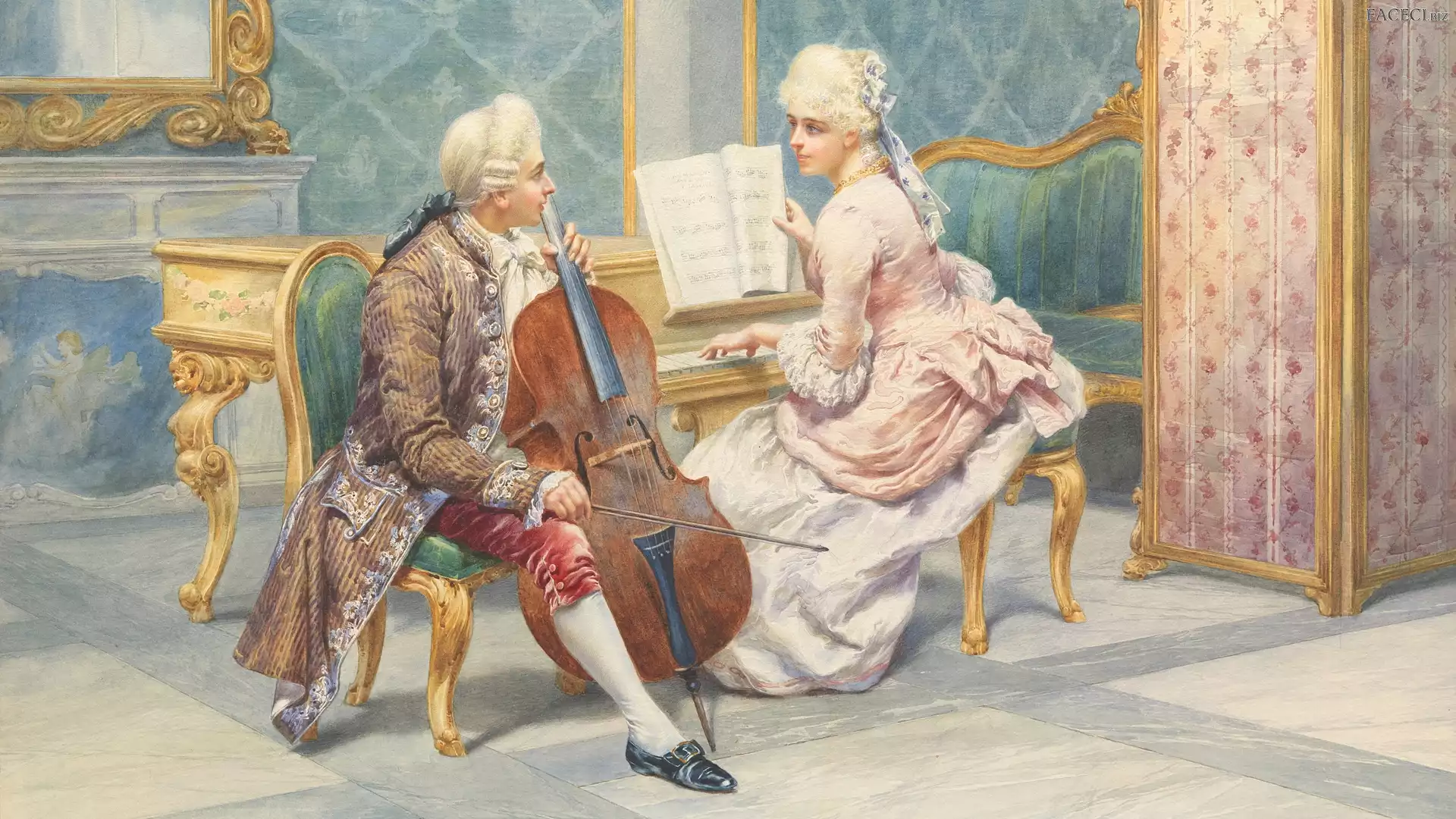 Wiolonczela, Pietro Gabrini, Malarstwo, Fortepian, Mężczyzna, Obraz, Kobieta - faceci.biz